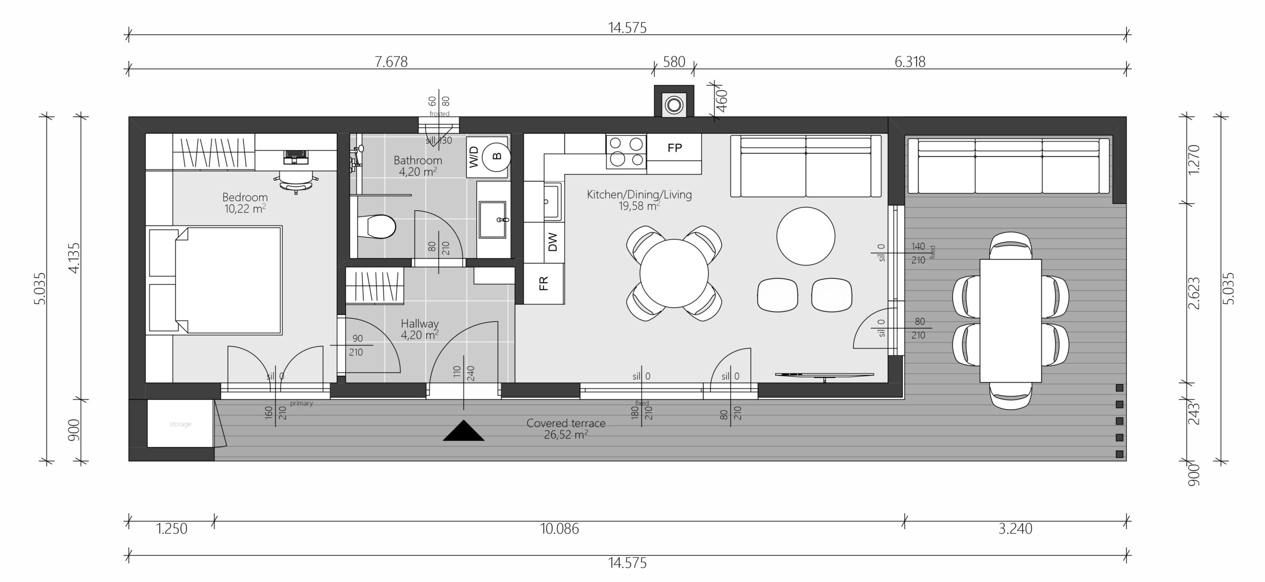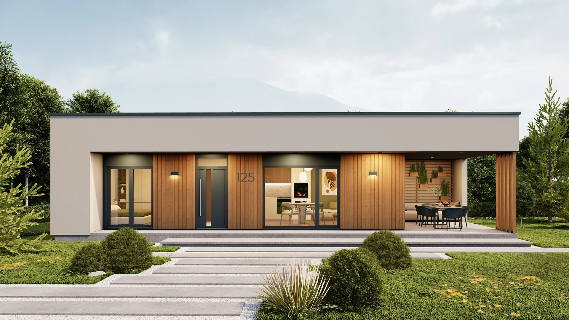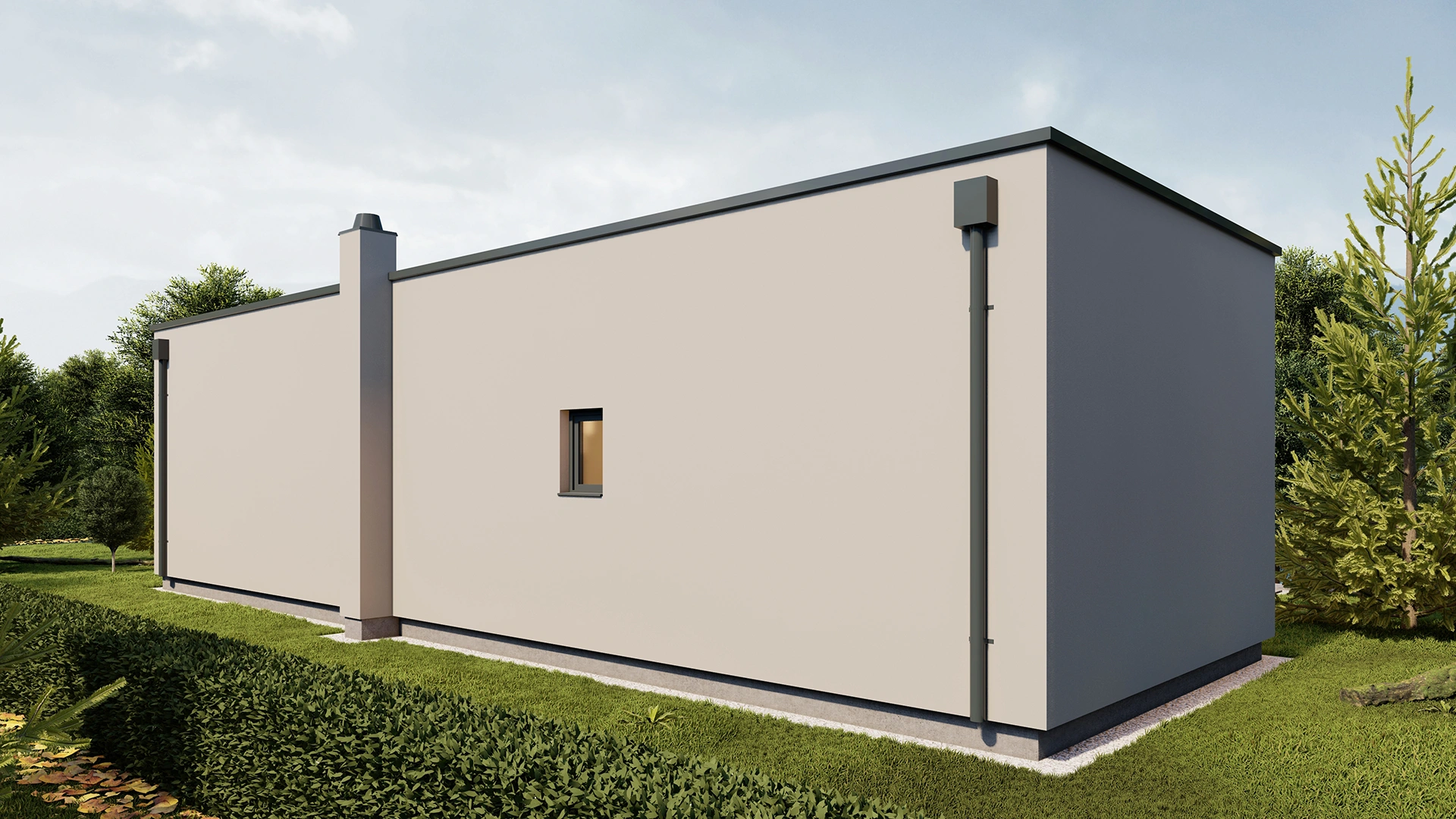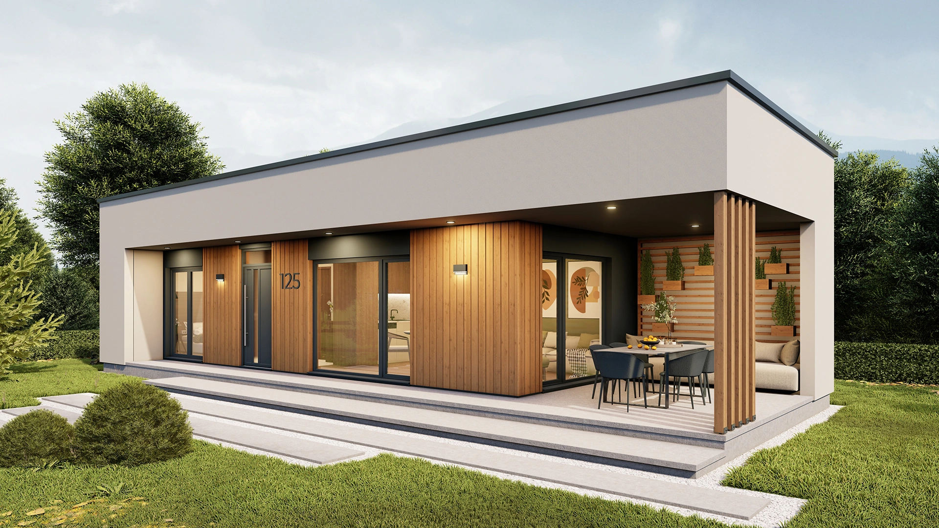 Die Kollektion: Bungalow Bruttofläche: 46.88 m2 Anzahl der Etagen: EG Dachtyp: Jednovodan krov, Ravni krov Dachneigung: Pultdach 8° Terrasse: 26.52 m2